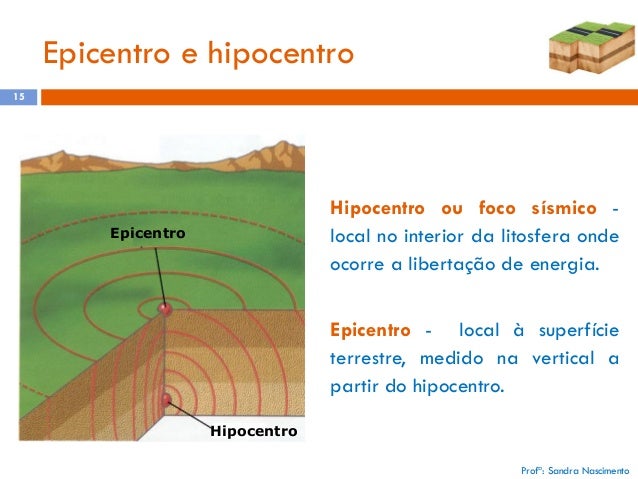 15. 15. Epicentro e hipocentro 15 Hipocentro ou foco sísmico local no interior da litosfera onde ocorre a libertação de energia. Epicentro Epicentro - local à superfície terrestre, medido na vertical a partir do hipocentro. Hipocentro Profª: Sandra Nascimento