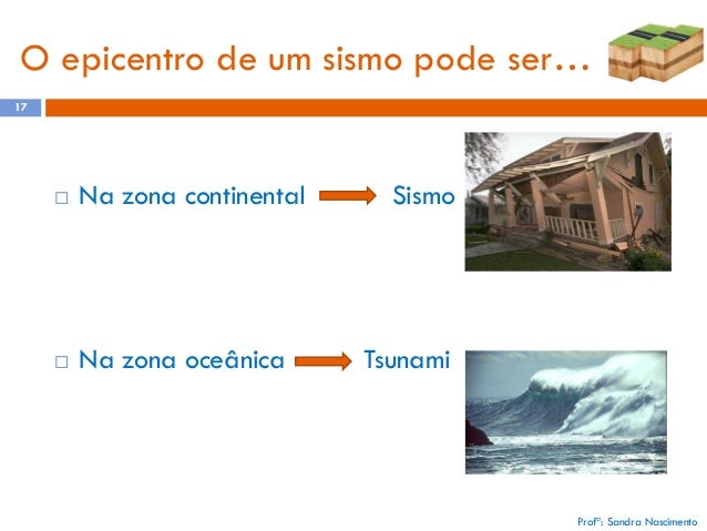 17. 17. O epicentro de um sismo pode ser… 17  Na zona continental  Na zona oceânica Sismo Tsunami Profª: Sandra Nascimento