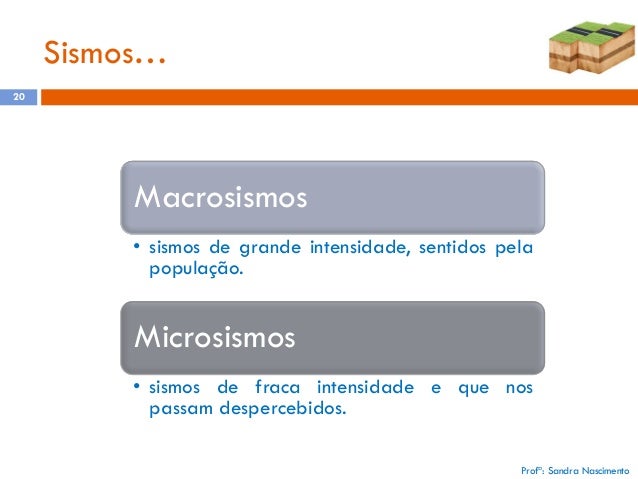 20. 20. Sismos… 20 Macrosismos • sismos de grande intensidade, sentidos pela população. Microsismos • sismos de fraca intensidade e que nos passam despercebidos. Profª: Sandra Nascimento