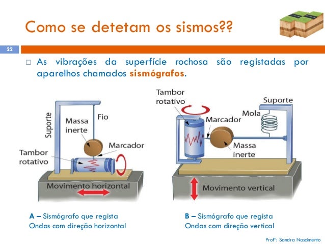 22. 22. Como se detetam os sismos?? 22  As vibrações da superfície rochosa são registadas por aparelhos chamados sismógrafos. A – Sismógrafo que regista Ondas com direção horizontal B – Sismógrafo que regista Ondas com direção vertical Profª: Sandra Nascimento
