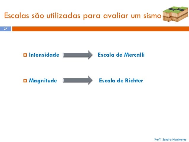 27. 27. Escalas são utilizadas para avaliar um sismo 27  Intensidade Escala de Mercalli  Magnitude Escala de Richter Profª: Sandra Nascimento