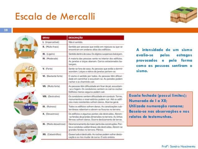 28. 28. Escala de Mercalli 28 A intensidade de um sismo avalia-se pelos estragos provocados e pela forma como as pessoas sentiram o sismo. Escala fechada (possui limites); Numerada de I a XII; Utilizada numeração romana; Baseia-se nas observações e nos relatos de testemunhas. Profª: Sandra Nascimento