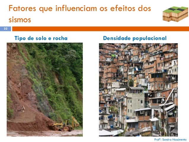 32. 32. Fatores que influenciam os efeitos dos sismos 32 Tipo de solo e rocha Densidade populacional Profª: Sandra Nascimento