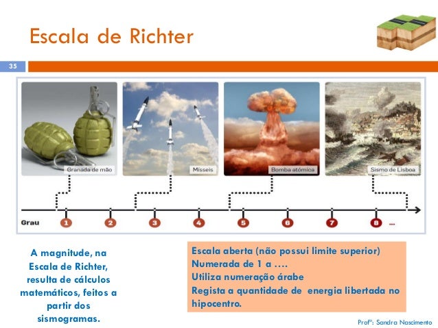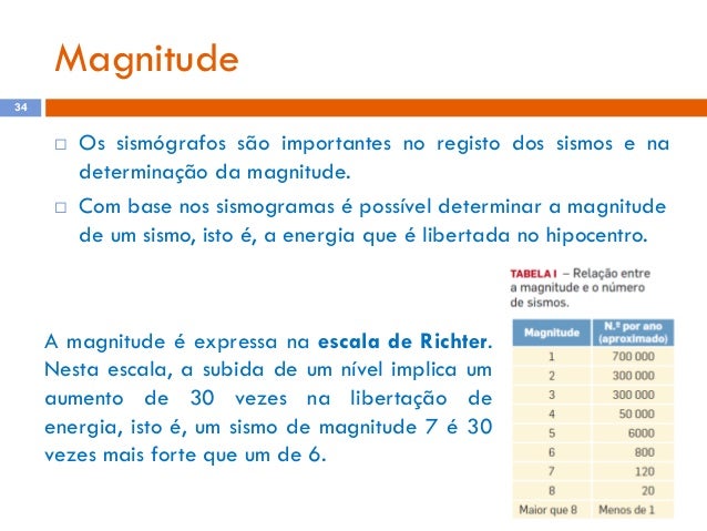 34. 34. Magnitude 34   Os sismógrafos são importantes no registo dos sismos e na determinação da magnitude. Com base nos sismogramas é possível determinar a magnitude de um sismo, isto é, a energia que é libertada no hipocentro. A magnitude é expressa na escala de Richter. Nesta escala, a subida de um nível implica um aumento de 30 vezes na libertação de energia, isto é, um sismo de magnitude 7 é 30 vezes mais forte que um de 6.