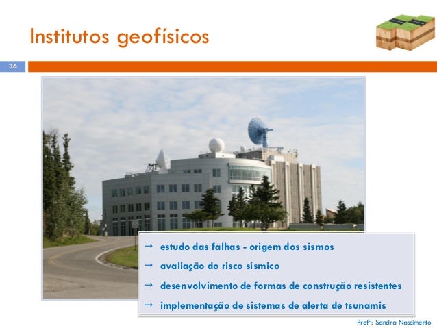 36. 36. Institutos geofísicos 36  estudo das falhas - origem dos sismos  avaliação do risco sísmico  desenvolvimento de formas de construção resistentes  implementação de sistemas de alerta de tsunamis Profª: Sandra Nascimento