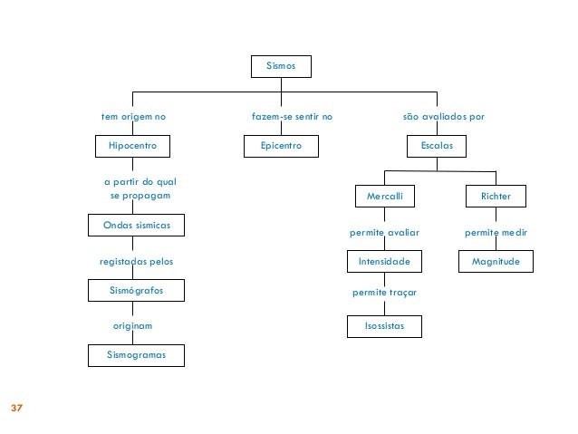 37. 37. Sismos tem origem no Hipocentro a partir do qual se propagam fazem-se sentir no são avaliados por Epicentro Escalas Mercalli Richter permite avaliar permite medir registadas pelos Intensidade Magnitude Sismógrafos permite traçar Ondas sísmicas originam Sismogramas 37 Isossistas