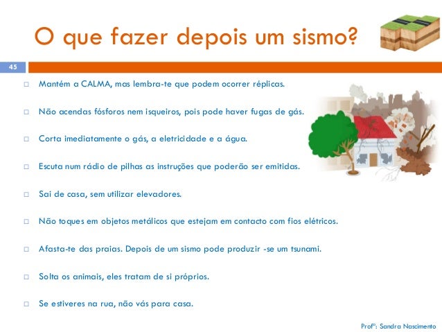 45. 45. O que fazer depois um sismo? 45  Mantém a CALMA, mas lembra-te que podem ocorrer réplicas.  Não acendas fósforos nem isqueiros, pois pode haver fugas de gás.  Corta imediatamente o gás, a eletricidade e a água.  Escuta num rádio de pilhas as instruções que poderão ser emitidas.  Sai de casa, sem utilizar elevadores.  Não toques em objetos metálicos que estejam em contacto com fios elétricos.  Afasta-te das praias. Depois de um sismo pode produzir -se um tsunami.  Solta os animais, eles tratam de si próprios.  Se estiveres na rua, não vás para casa. Profª: Sandra Nascimento
