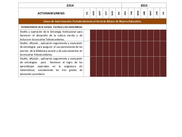 11. 11. 2014 2015 ACTIVIDADES/MESES JUL AGO SEPT OCT NOV DIC ENE FEB MAR ABR MAY JUN JUL Línea de intervención: Fortalecimiento al Servicio Básico de Mejora Educativa. Fortalecimiento de la Lectura, Escritura y las matemáticas Diseño y operación de la Estrategia Institucional para favorecer el desarrollo de la cultura escrita y de lectura en las escuelas Telesecundarias. Diseño, difusión , aplicación seguimiento y evaluación de estrategias para asegurar el uso permanente de los acervos de la Biblioteca escolar y de aula existentes en las escuelas Telesecundarias. Diseño, difusión , aplicación seguimiento y evaluación de estrategias para favorecer el logro de los aprendizajes esperados en la asignatura de matemáticas, considerando los tres grados de educación secundaria.