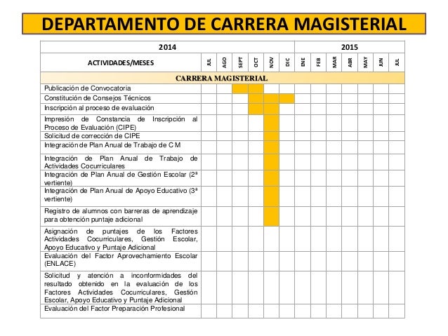 14. 14. DEPARTAMENTO DE CARRERA MAGISTERIAL 2014 2015 ACTIVIDADES/MESES JUL AGO SEPT OCT NOV DIC ENE FEB MAR ABR MAY JUN JUL CARRERA MAGISTERIAL Publicación de Convocatoria Constitución de Consejos Técnicos Inscripción al proceso de evaluación Impresión de Constancia de Inscripción al Proceso de Evaluación (CIPE) Solicitud de corrección de CIPE Integración de Plan Anual de Trabajo de C M Integración de Plan Anual de Trabajo de Actividades Cocurriculares Integración de Plan Anual de Gestión Escolar (2ª vertiente) Integración de Plan Anual de Apoyo Educativo (3ª vertiente) Registro de alumnos con barreras de aprendizaje para obtención puntaje adicional Asignación de puntajes de los Factores Actividades Cocurriculares, Gestión Escolar, Apoyo Educativo y Puntaje Adicional Evaluación del Factor Aprovechamiento Escolar (ENLACE) Solicitud y atención a inconformidades del resultado obtenido en la evaluación de los Factores Actividades Cocurriculares, Gestión Escolar, Apoyo Educativo y Puntaje Adicional Evaluación del Factor Preparación Profesional