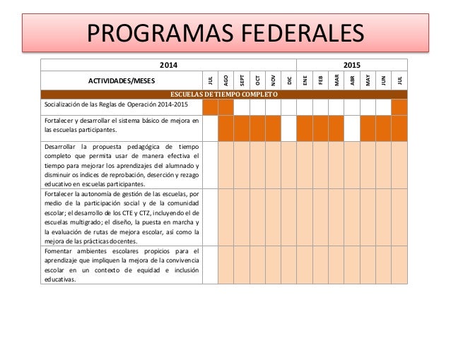 16. 16. PROGRAMAS FEDERALES 2014 2015 ACTIVIDADES/MESES JUL AGO SEPT OCT NOV DIC ENE FEB MAR ABR MAY JUN JUL ESCUELAS DE TIEMPO COMPLETO Socialización de las Reglas de Operación 2014-2015 Fortalecer y desarrollar el sistema básico de mejora en las escuelas participantes. Desarrollar la propuesta pedagógica de tiempo completo que permita usar de manera efectiva el tiempo para mejorar los aprendizajes del alumnado y disminuir os índices de reprobación, deserción y rezago educativo en escuelas participantes. Fortalecer la autonomía de gestión de las escuelas, por medio de la participación social y de la comunidad escolar; el desarrollo de los CTE y CTZ, incluyendo el de escuelas multigrado; el diseño, la puesta en marcha y la evaluación de rutas de mejora escolar, así como la mejora de las prácticas docentes. Fomentar ambientes escolares propicios para el aprendizaje que impliquen la mejora de la convivencia escolar en un contexto de equidad e inclusión educativas.