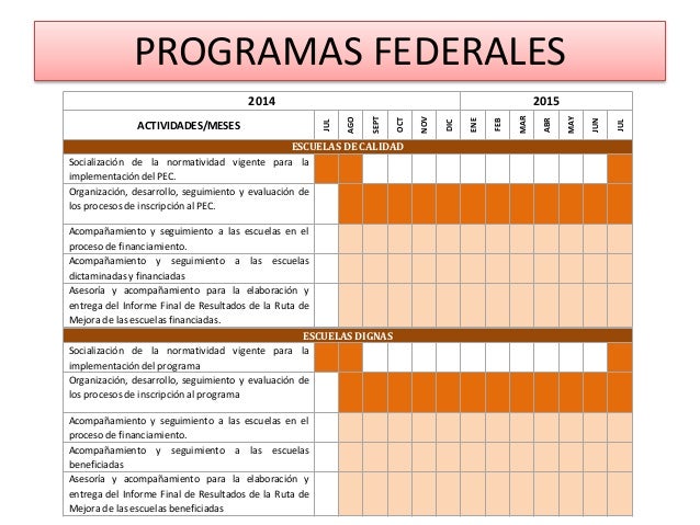 17. 17. PROGRAMAS FEDERALES 2014 2015 ACTIVIDADES/MESES JUL AGO SEPT OCT NOV DIC ENE FEB MAR ABR MAY JUN JUL ESCUELAS DE CALIDAD Socialización de la normatividad vigente para la implementación del PEC. Organización, desarrollo, seguimiento y evaluación de los procesos de inscripción al PEC. Acompañamiento y seguimiento a las escuelas en el proceso de financiamiento. Acompañamiento y seguimiento a las escuelas dictaminadas y financiadas Asesoría y acompañamiento para la elaboración y entrega del Informe Final de Resultados de la Ruta de Mejora de las escuelas financiadas. ESCUELAS DIGNAS Socialización de la normatividad vigente para la implementación del programa Organización, desarrollo, seguimiento y evaluación de los procesos de inscripción al programa Acompañamiento y seguimiento a las escuelas en el proceso de financiamiento. Acompañamiento y seguimiento a las escuelas beneficiadas Asesoría y acompañamiento para la elaboración y entrega del Informe Final de Resultados de la Ruta de Mejora de las escuelas beneficiadas