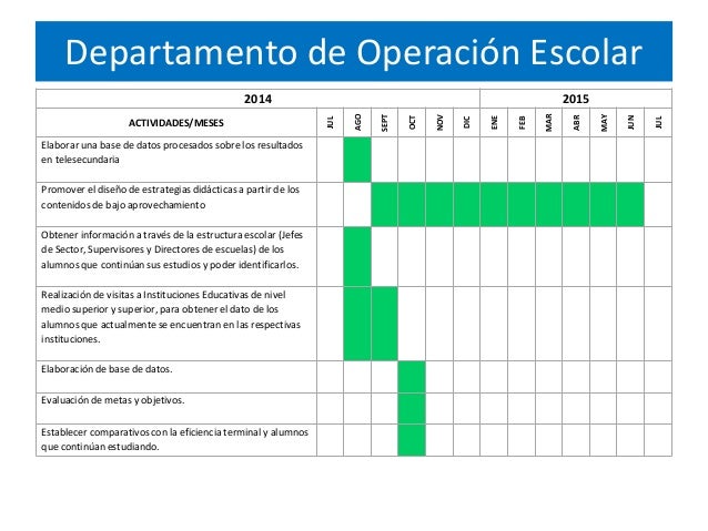2. 2. Departamento de Operación Escolar 2014 2015 ACTIVIDADES/MESES JUL AGO SEPT OCT NOV DIC ENE FEB MAR ABR MAY JUN JUL Elaborar una base de datos procesados sobre los resultados en telesecundaria Promover el diseño de estrategias didácticas a partir de los contenidos de bajo aprovechamiento Obtener información a través de la estructura escolar (Jefes de Sector, Supervisores y Directores de escuelas) de los alumnos que continúan sus estudios y poder identificarlos. Realización de visitas a Instituciones Educativas de nivel medio superior y superior, para obtener el dato de los alumnos que actualmente se encuentran en las respectivas instituciones. Elaboración de base de datos. Evaluación de metas y objetivos. Establecer comparativos con la eficiencia terminal y alumnos que continúan estudiando.