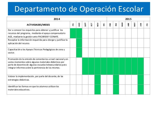 3. 3. Departamento de Operación Escolar 2014 2015 ACTIVIDADES/MESES JUL AGO SEPT OCT NOV DIC ENE FEB MAR ABR MAY JUN JUL Dar a conocer los requisitos para obtener y justificar los recursos del programa, mediante el apoyo compensatorio AGE, mediante la gestión ante PACAREIB Y CONAFE. Recopilar la información requerida para otorgar y justificar la aplicación del recurso. Capacitación a los Apoyos Técnicos Pedagógicos de zona y sector. Promoción de la emisión de comentarios a nivel nacional y en varios momentos sobre algunos materiales didácticos por parte de docentes de algunas escuelas telesecundarias para integrar informes sobre la pertinencia de los mismos. Valorar la implementación, por parte del docente, de las estrategias didácticas. Identificar las formas en que los alumnos utilizan los materiales educativos.