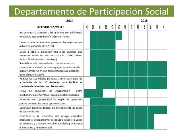 6. 6. Departamento de Participación Social 2014 2015 ACTIVIDADES/MESES JUL AGO SEPT OCT NOV DIC ENE FEB MAR ABR MAY JUN JUL Incrementar la atención a los alumnos con deficiencia visual para que sean beneficiados con lentes. Llevar a cabo la detección gruesa en las regiones que autoricen por parte de la SEED. Llevar a cabo la detección fina a los alumnos que necesiten lentes en tres zonas de la ciudad (Mano Amiga, El Saltito, Cinco de Mayo) Sensibilizar a la comunidad escolar en temas de prevención a situaciones que aquejan en nuestra vida diaria y ofrecer atención psicoterapéutica a personas que solicitan el apoyo Realizar las actividades planeadas en el calendario de actividades de las 15 Acciones para facilitar el combate de la violencia en las escuelas. Firma de convenios de colaboración entre instituciones que forman el equipo multidisciplinario. Promover con oportunidad las reglas de operación para el acceso a las becas oportunidades Contribuir al control federal del otorgamiento de becas de oportunidades Contribuir a la reducción del rezago educativo mediante el otorgamiento de becas a niñas y jóvenes en contexto y situación de vulnerabilidad agravada por el embarazo y la maternidad.