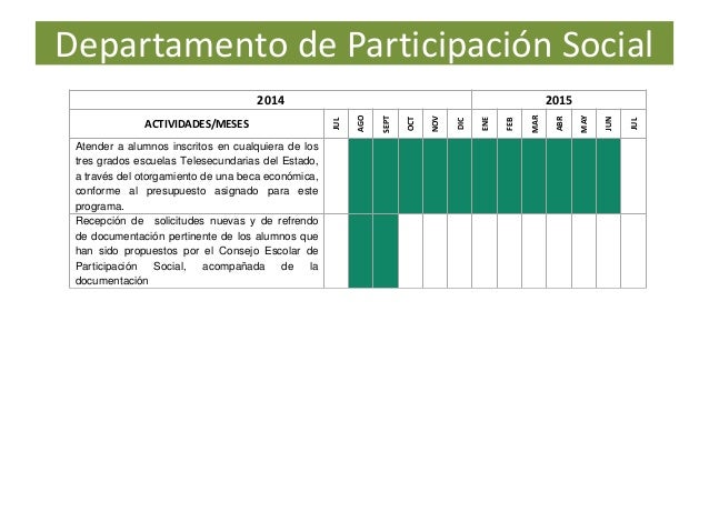 7. 7. Departamento de Participación Social 2014 2015 ACTIVIDADES/MESES JUL AGO SEPT OCT NOV DIC ENE FEB MAR ABR MAY JUN JUL Atender a alumnos inscritos en cualquiera de los tres grados escuelas Telesecundarias del Estado, a través del otorgamiento de una beca económica, conforme al presupuesto asignado para este programa. Recepción de solicitudes nuevas y de refrendo de documentación pertinente de los alumnos que han sido propuestos por el Consejo Escolar de Participación Social, acompañada de la documentación