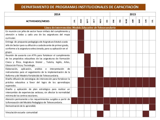 8. 8. 2014 2015 ACTIVIDADES/MESES JUL AGO SEPT OCT NOV DIC ENE FEB MAR ABR MAY JUN JUL Línea de intervención: Modelo Educativo de Telesecundaria En reunión con jefes de sector hacer énfasis del cumplimiento y atención a todas y cada una de las asignaturas del mapa curricular. Entrega de propuesta pedagógica de Asignatura Estatal a cada Jefe de Sector para su difusión a cada docente de primer grado, conforme a la asignatura seleccionada, para su aplicación en el grupo. Reunión de asesoría con ATPs para fortalecer el cumplimiento de los propósitos educativos de las asignaturas de Formación Cívica y Ética, Asignatura Estatal , Tutoría, Inglés, Artes, Educación Física y Tecnología. Elaboración, aplicación, análisis e interpretación de instrumentos para el seguimiento de la implementación de la Reforma y del Modelo Fortalecido de Telesecundaria. Diseño difusión de estrategias de intervención para fortalecer la práctica educativa a favor del logro de los aprendizajes esperados. Diseño y aplicación de plan estratégico para realizar un intercambio de experiencias exitosas, sin afectar la normalidad mínima de los centros escolares. Atención permanente a los requerimientos surgidos a partir de la Renovación del Modelo Pedagógico de Telesecundaria. Demostración de lo aprendido Vinculación escuela- comunidad DEPARTAMENTO DE PROGRAMAS INSTITUCIONALES DE CAPACITACIÓN