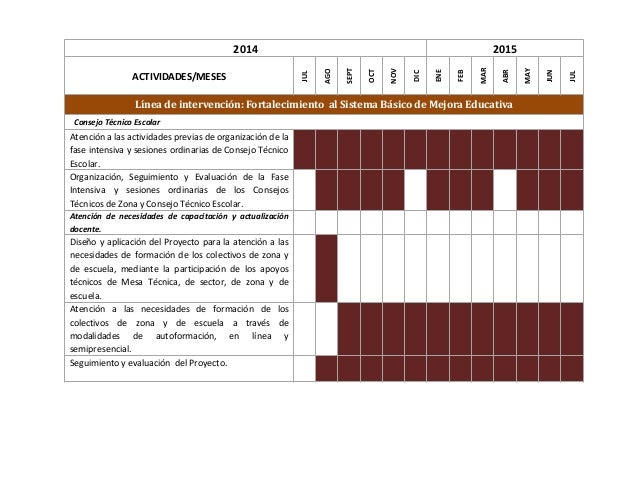 9. 9. 2014 2015 ACTIVIDADES/MESES JUL AGO SEPT OCT NOV DIC ENE FEB MAR ABR MAY JUN JUL Línea de intervención: Fortalecimiento al Sistema Básico de Mejora Educativa Consejo Técnico Escolar Atención a las actividades previas de organización de la fase intensiva y sesiones ordinarias de Consejo Técnico Escolar. Organización, Seguimiento y Evaluación de la Fase Intensiva y sesiones ordinarias de los Consejos Técnicos de Zona y Consejo Técnico Escolar. Atención de necesidades de capacitación y actualización docente. Diseño y aplicación del Proyecto para la atención a las necesidades de formación de los colectivos de zona y de escuela, mediante la participación de los apoyos técnicos de Mesa Técnica, de sector, de zona y de escuela. Atención a las necesidades de formación de los colectivos de zona y de escuela a través de modalidades de autoformación, en línea y semipresencial. Seguimiento y evaluación del Proyecto.