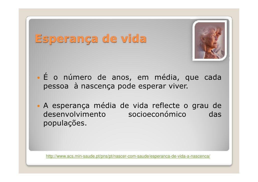 10. 10. Esperança de vida É o número de anos, em média, que cada pessoa à nascença pode esperar viver. A esperança média de vida reflecte o grau de desenvolvimento socioeconómico das populações. http://www.acs.min-saude.pt/pns/pt/nascer-com-saude/esperanca-de-vida-a-nascenca/