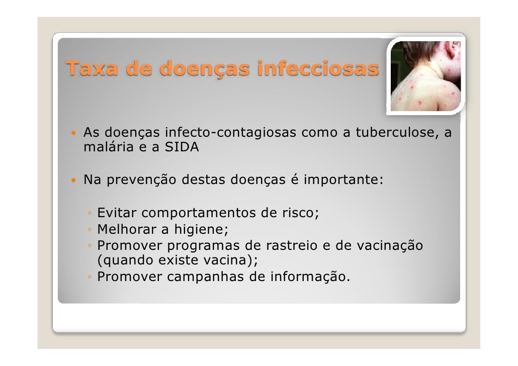 15. 15. Taxa de doenças infecciosas As doenças infecto-contagiosas como a tuberculose, a malária e a SIDA Na prevenção destas doenças é importante: ◦ Evitar comportamentos de risco; ◦ Melhorar a higiene; ◦ Promover programas de rastreio e de vacinação (quando existe vacina); ◦ Promover campanhas de informação.