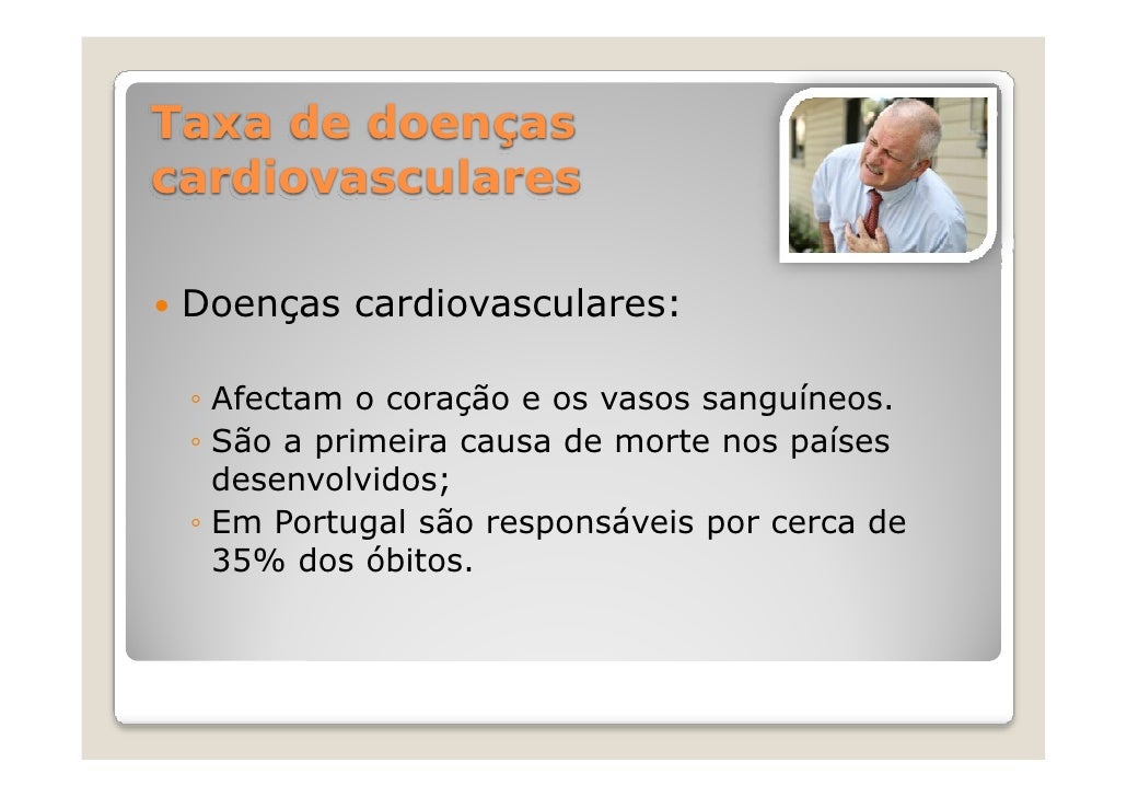 16. 16. Taxa de doenças cardiovasculares Doenças cardiovasculares: ◦ Afectam o coração e os vasos sanguíneos. ◦ São a primeira causa de morte nos países desenvolvidos; ◦ Em Portugal são responsáveis por cerca de 35% dos óbitos.