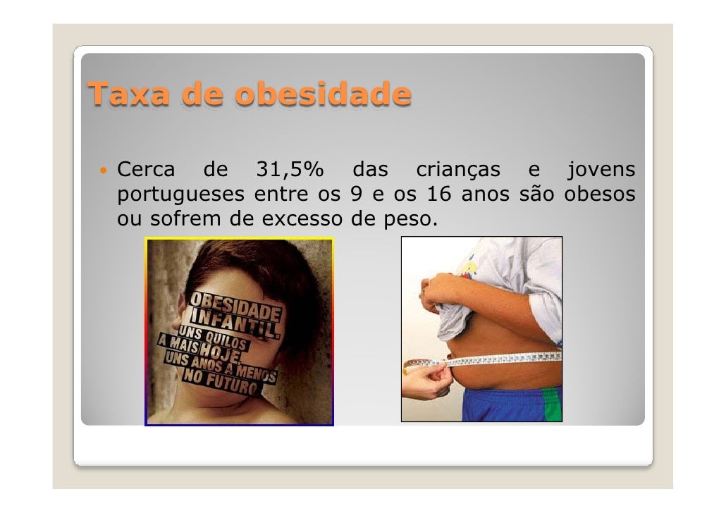 19. 19. Taxa de obesidade Cerca de 31,5% das crianças e jovens portugueses entre os 9 e os 16 anos são obesos ou sofrem de excesso de peso.