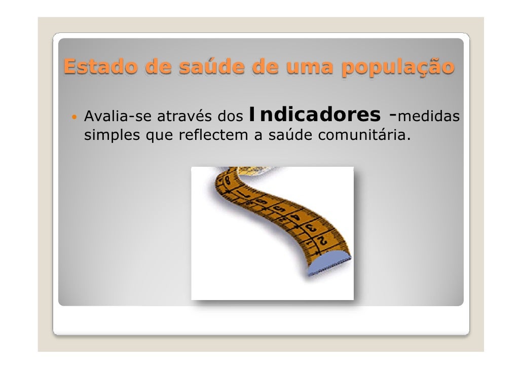 2. 2. Estado de saúde de uma população Avalia-se através dos Indicadores -medidas simples que reflectem a saúde comunitária.