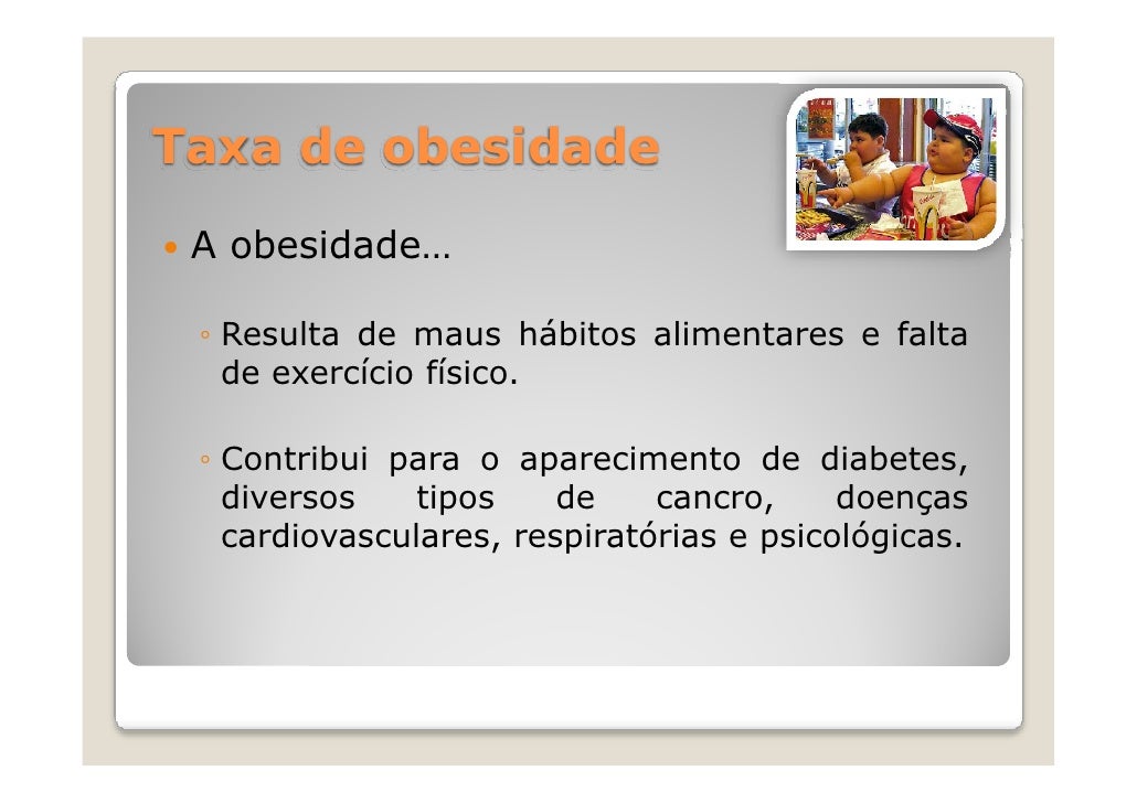 18. 18. Taxa de obesidade A obesidade… ◦ Resulta de maus hábitos alimentares e falta de exercício físico. ◦ Contribui para o aparecimento de diabetes, diversos tipos de cancro, doenças cardiovasculares, respiratórias e psicológicas.