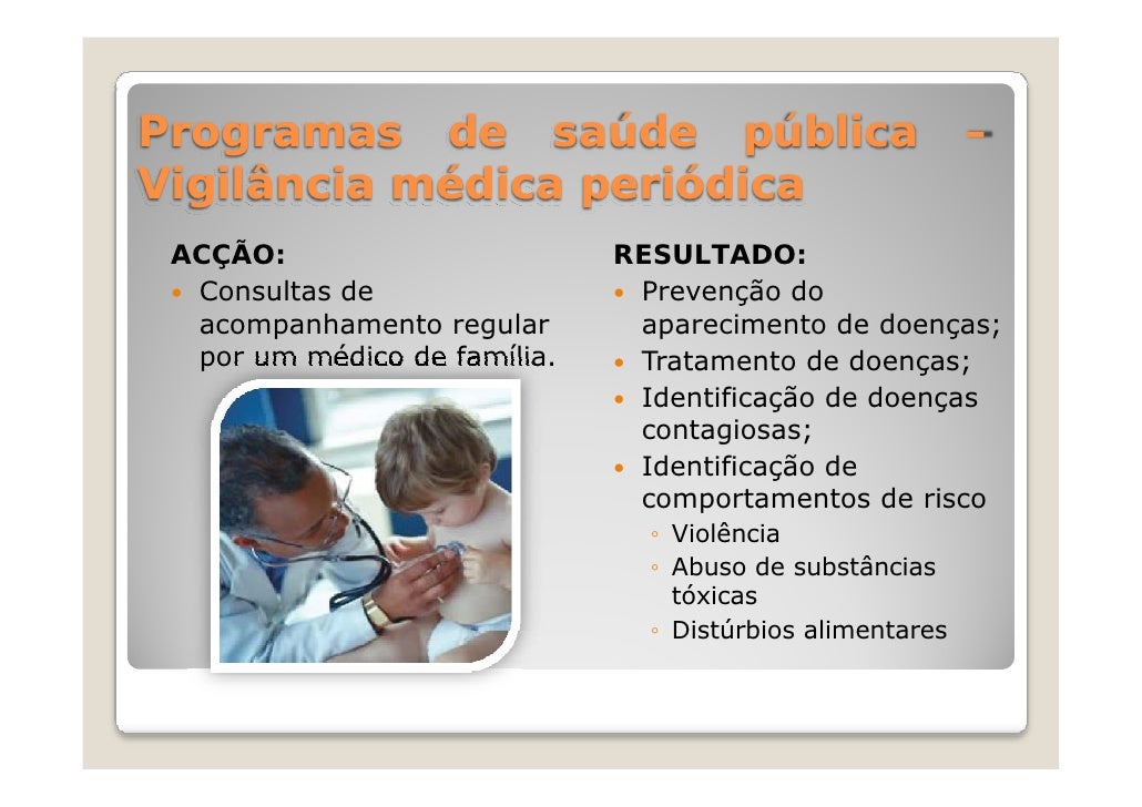22. 22. Programas de saúde pública – Vigilância médica periódica ACÇÃO: RESULTADO: Consultas de Prevenção do acompanhamento regular aparecimento de doenças; por um médico de família. Tratamento de doenças; Identificação de doenças contagiosas; Identificação de comportamentos de risco ◦ Violência ◦ Abuso de substâncias tóxicas ◦ Distúrbios alimentares