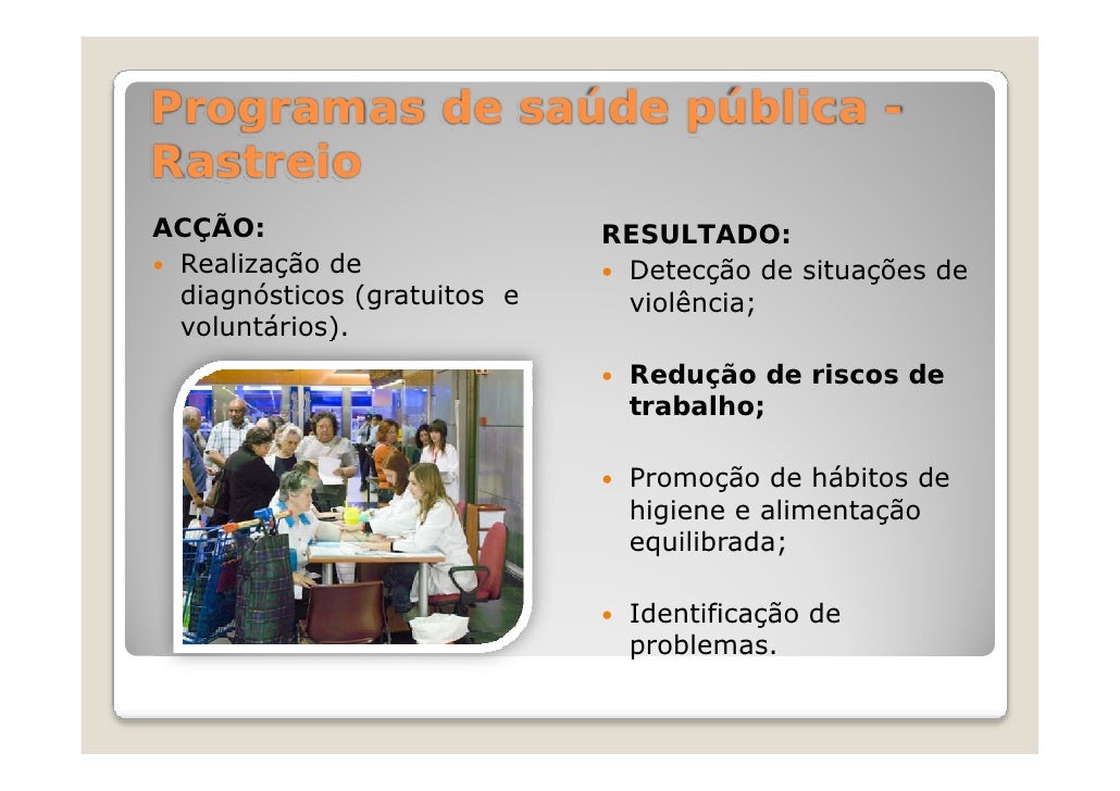23. 23. Programas de saúde pública - Rastreio ACÇÃO: RESULTADO: Realização de Detecção de situações de diagnósticos (gratuitos e violência; voluntários). Redução de riscos de trabalho; Promoção de hábitos de higiene e alimentação equilibrada; Identificação de problemas.