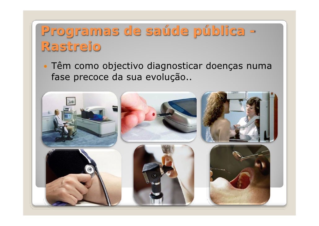 24. 24. Programas de saúde pública - Rastreio Têm como objectivo diagnosticar doenças numa fase precoce da sua evolução..