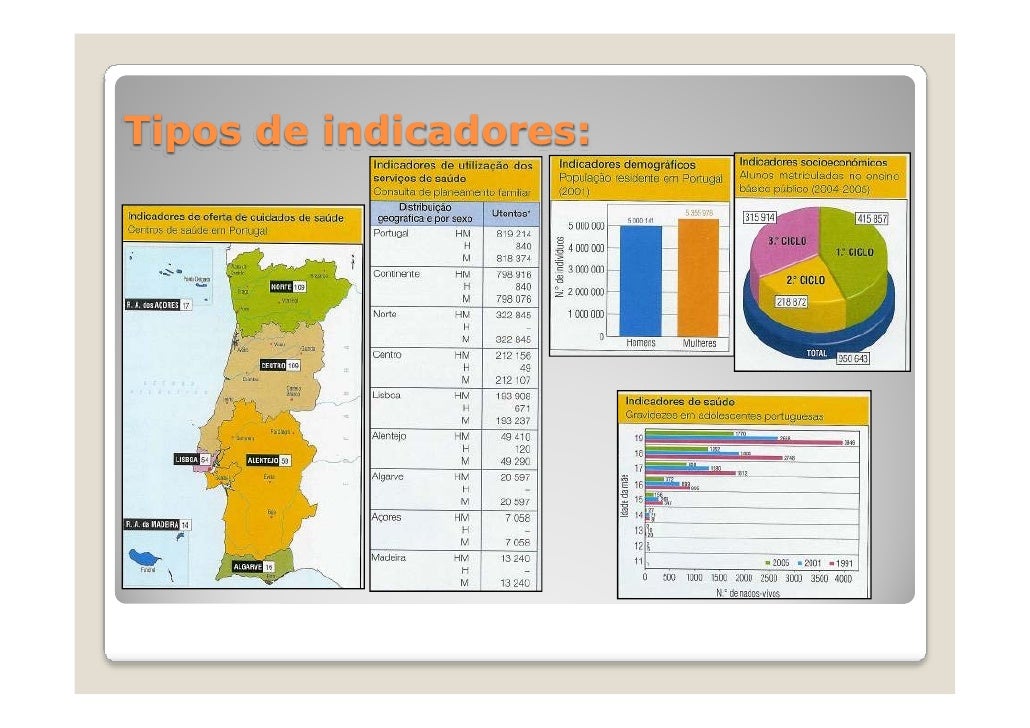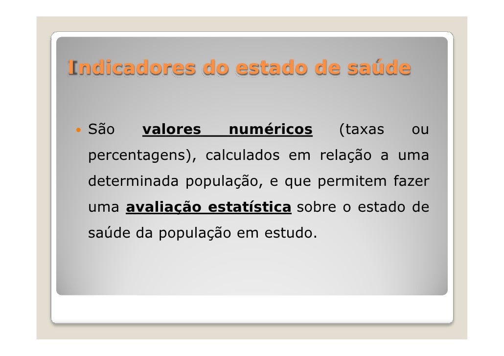 3. 3. Indicadores do estado de saúde São valores numéricos (taxas ou percentagens), calculados em relação a uma determinada população, e que permitem fazer uma avaliação estatística sobre o estado de saúde da população em estudo.