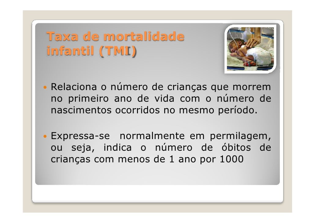 7. 7. Taxa de mortalidade infantil (TMI) Relaciona o número de crianças que morrem no primeiro ano de vida com o número de nascimentos ocorridos no mesmo período. Expressa-se normalmente em permilagem, ou seja, indica o número de óbitos de crianças com menos de 1 ano por 1000