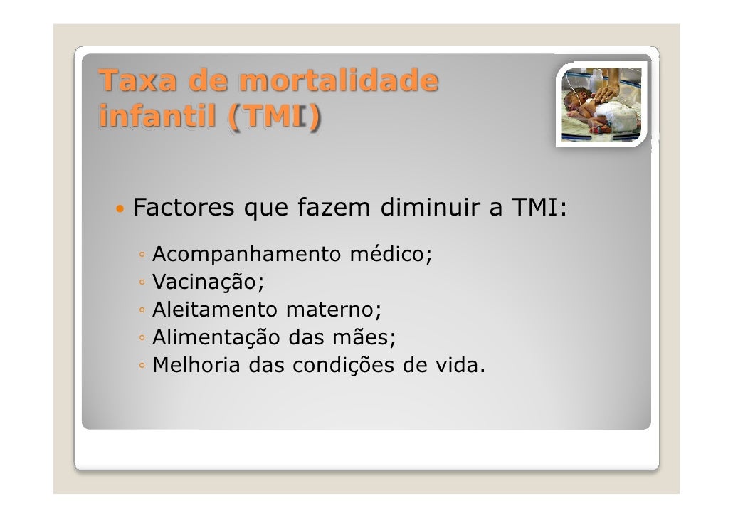 9. 9. Taxa de mortalidade infantil (TMI) Factores que fazem diminuir a TMI: ◦ Acompanhamento médico; ◦ Vacinação; ◦ Aleitamento materno; ◦ Alimentação das mães; ◦ Melhoria das condições de vida.