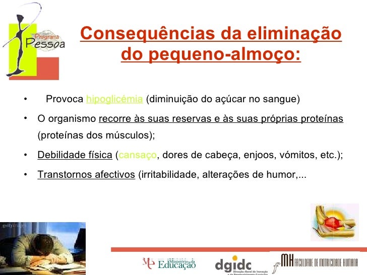 14. 14. Consequências da eliminação do pequeno-almoço: <ul><li>  Provoca hipoglicémia (diminuição do açúcar no sangue) </li></ul><ul><li>O organismo recorre às suas reservas e às suas próprias proteínas (proteínas dos músculos); </li></ul><ul><li>Debilidade física ( cansaço , dores de cabeça, enjoos, vómitos, etc.); </li></ul><ul><li>Transtornos afectivos (irritabilidade, alterações de humor,... </li></ul>