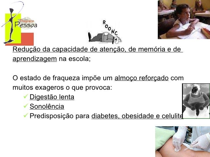 15. 15. <ul><li>Redução da capacidade de atenção, de memória e de </li></ul><ul><li>aprendizagem na escola; </li></ul><ul><li>O estado de fraqueza impõe um almoço reforçado com </li></ul><ul><li>muitos exageros o que provoca: </li></ul><ul><ul><li>Digestão lenta </li></ul></ul><ul><ul><li>Sonolência </li></ul></ul><ul><ul><li>Predisposição para diabetes, obesidade e celulite . </li></ul></ul>
