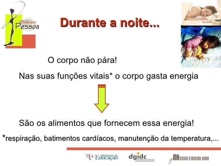Durante a noite... O corpo não pára! Nas suas funções vitais* o corpo gasta energia São os alimentos que fornecem essa ene...