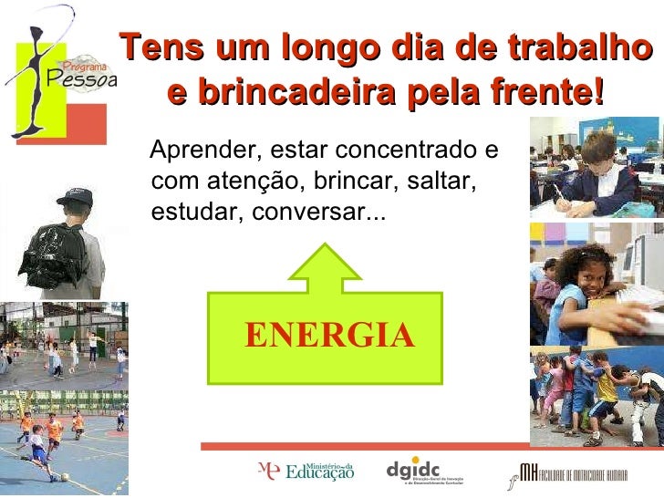 5. 5. Tens um longo dia de trabalho e brincadeira pela frente! Aprender, estar concentrado e com atenção, brincar, saltar, estudar, conversar... ENERGIA