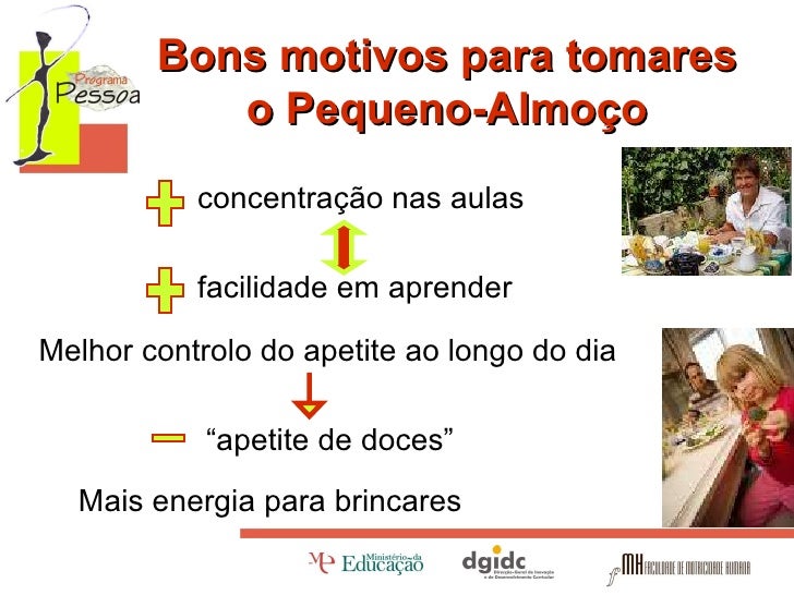6. 6. <ul><li>concentração nas aulas </li></ul><ul><li>facilidade em aprender </li></ul><ul><li>Melhor controlo do apetite ao longo do dia </li></ul><ul><ul><li> “ apetite de doces” </li></ul></ul><ul><ul><li>Mais energia para brincares </li></ul></ul>Bons motivos para tomares o Pequeno-Almoço
