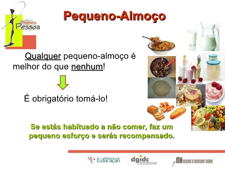 7. 7. Pequeno-Almoço Qualquer pequeno-almoço é melhor do que nenhum ! É obrigatório tomá-lo! Se estás habituado a não comer, faz um pequeno esforço e serás recompensado. Pequeno-Almoço