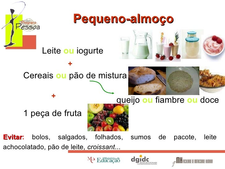 8. 8. Pequeno-almoço Leite ou iogurte + Cereais ou pão de mistura queijo ou fiambre ou doce 1 peça de fruta + Evitar : bolos, salgados, folhados, sumos de pacote, leite achocolatado, pão de leite, croissant ...