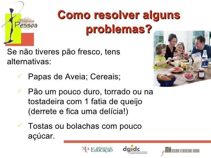 9. 9. Como resolver alguns problemas? <ul><li>Se não tiveres pão fresco, tens </li></ul><ul><li>alternativas: </li></ul><ul><ul><li>Papas de Aveia; Cereais; </li></ul></ul><ul><ul><li>Pão um pouco duro, torrado ou na tostadeira com 1 fatia de queijo (derrete e fica uma delícia!) </li></ul></ul><ul><ul><li>Tostas ou bolachas com pouco açúcar. </li></ul></ul>