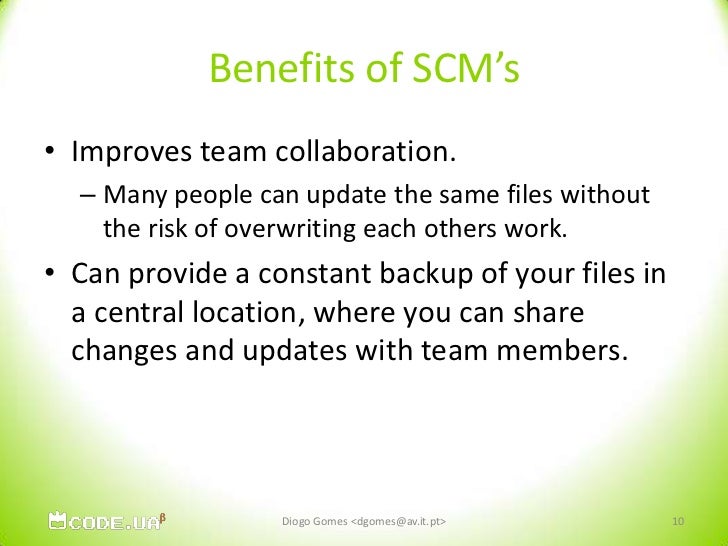 10. 10. Benefits of SCM’s<br />Improves team collaboration. <br />Many people can update the same files without the risk of overwriting each others work.<br />Can provide a constant backup of your files in a central location, where you can share changes and updates with team members. <br />Diogo Gomes <dgomes@av.it.pt><br />10<br />
