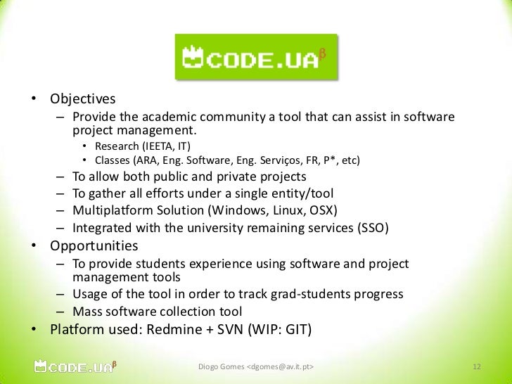 12. 12. CodeUA<br />Objectives<br />Provide the academic community a tool that can assist in software project management.<br />Research (IEETA, IT)<br />Classes (ARA, Eng. Software, Eng. Serviços, FR, P*, etc)<br />To allow both public and private projects<br />To gather all efforts under a single entity/tool<br />Multiplatform Solution (Windows, Linux, OSX)<br />Integrated with the university remaining services (SSO)<br />Opportunities<br />To provide students experience using software and project management tools<br />Usage of the tool in order to track grad-students progress<br />Mass software collection tool <br />Platform used: Redmine + SVN (WIP: GIT)<br />12<br />Diogo Gomes <dgomes@av.it.pt><br />