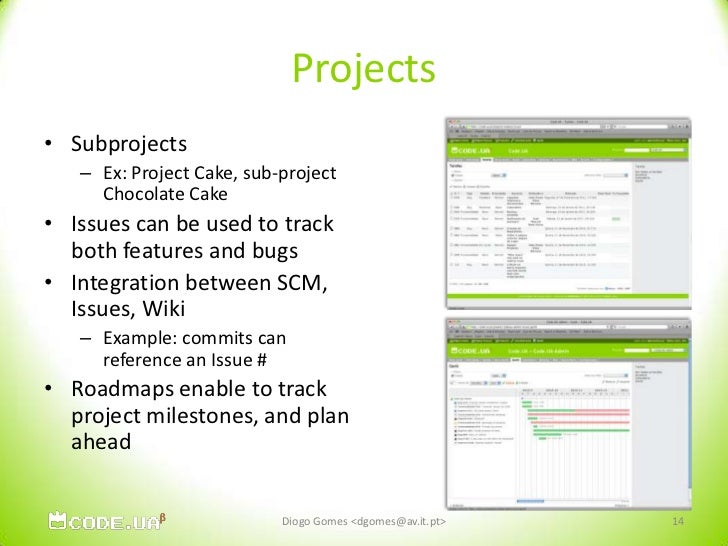 14. 14. Projects<br />Subprojects<br />Ex: Project Cake, sub-project Chocolate Cake<br />Issues can be used to track both features and bugs<br />Integration between SCM, Issues, Wiki<br />Example: commits can reference an Issue #<br />Roadmaps enable to track project milestones, and plan ahead<br />14<br />Diogo Gomes <dgomes@av.it.pt><br />