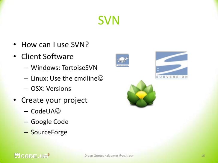 16. 16. SVN<br />How can I use SVN?<br />Client Software<br />Windows: TortoiseSVN<br />Linux: Use the cmdline<br />OSX: Versions<br />Create your project<br />CodeUA<br />Google Code<br />SourceForge<br />Diogo Gomes <dgomes@av.it.pt><br />16<br />