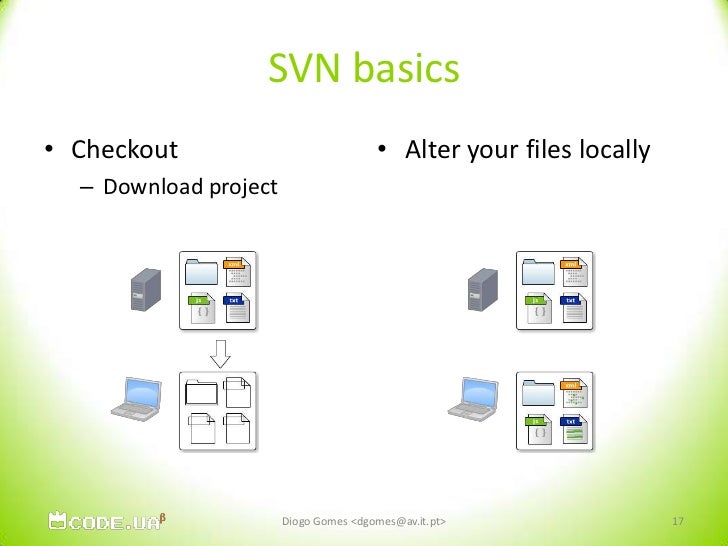 17. 17. SVN basics<br />Checkout<br />Download project<br />Alter your files locally<br />Diogo Gomes <dgomes@av.it.pt><br />17<br />