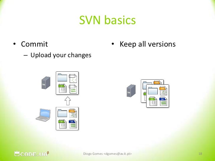 18. 18. SVN basics<br />Commit<br />Upload your changes<br />Keep all versions<br />Diogo Gomes <dgomes@av.it.pt><br />18<br />