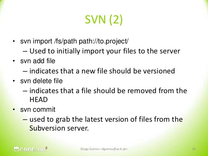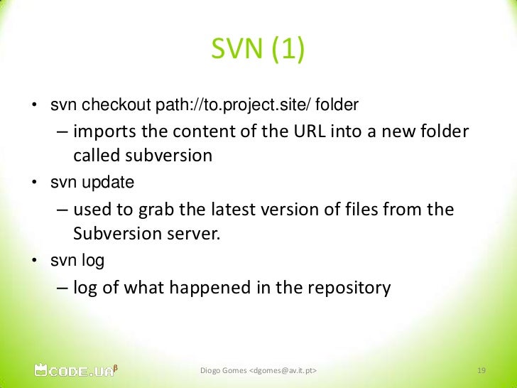 19. 19. SVN (1)<br />svn checkout path://to.project.site/ folder<br />imports the content of the URL into a new folder called subversion<br />svn update<br />used to grab the latest version of files from the Subversion server. <br />svn log<br />log of what happened in the repository<br />Diogo Gomes <dgomes@av.it.pt><br />19<br />