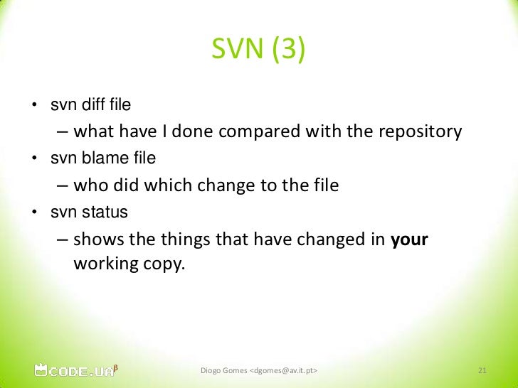21. 21. SVN (3)<br />svn diff file<br />what have I done compared with the repository <br />svn blame file<br />who did which change to the file<br />svn status<br />shows the things that have changed in your working copy. <br />Diogo Gomes <dgomes@av.it.pt><br />21<br />