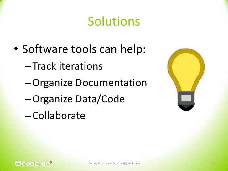 5. 5. Solutions<br />Software tools can help:<br />Track iterations<br />Organize Documentation<br />Organize Data/Code<br />Collaborate<br />Diogo Gomes <dgomes@av.it.pt><br />5<br />